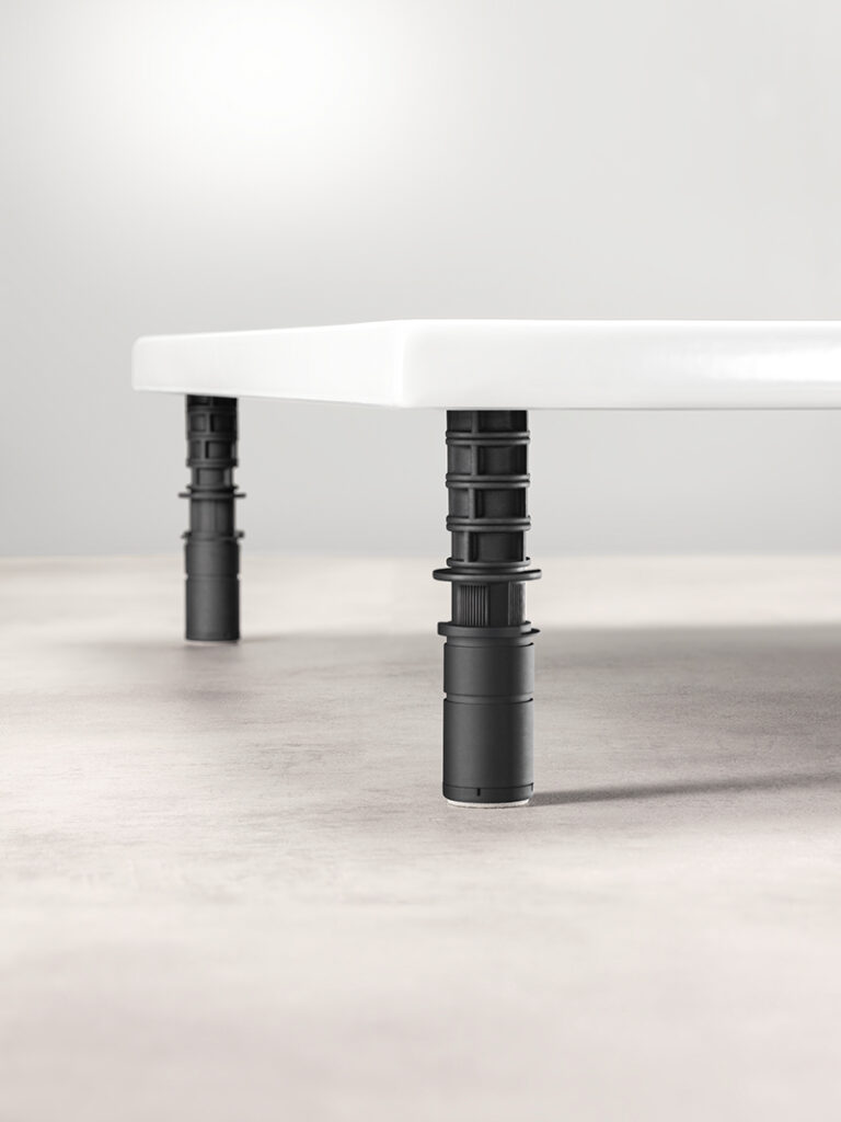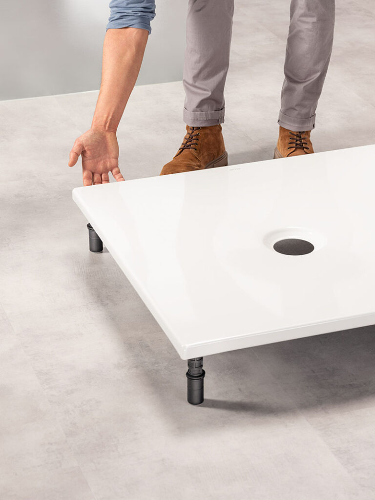 BetteLevel ist ein Montagefuß mit dem deine Dusche beispiellos, schnell und einfach ausgerichtet werden kann.